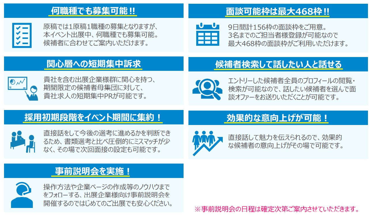 ・本イベントでの“面談”は、選考ではないため、その場での選考結果の通知はお控ください。