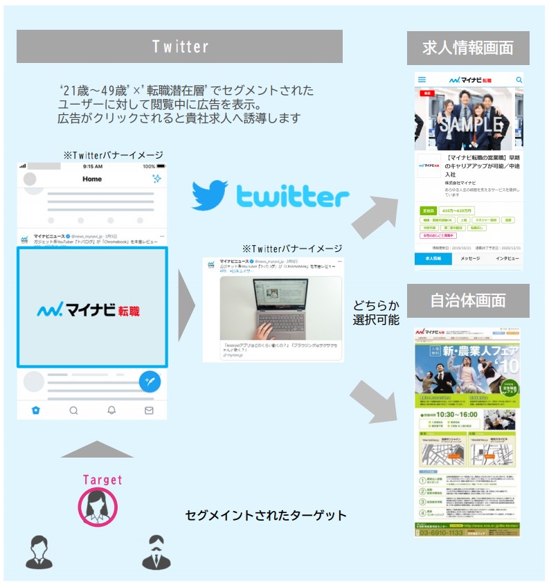 “21歳~49歳” ”転職潜在層”で絞り込んだターゲットをマイナビ転職上の貴社求人画面または自治体画面に誘導します。