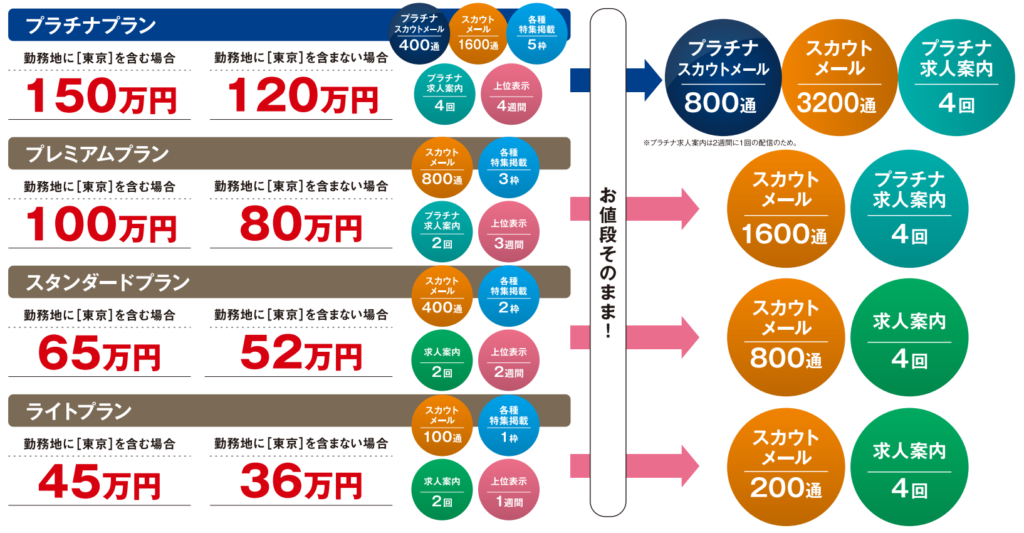 | プラチナプラン | 勤務地に[東京]を含む場合 | 定価260万円⇒150万円 |