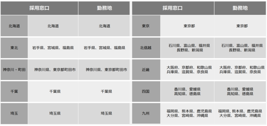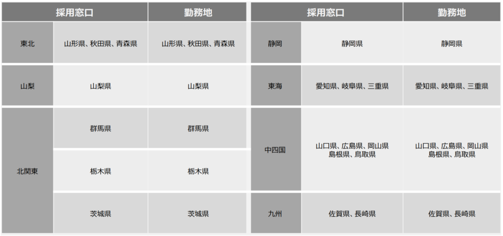 【エリアA】採用窓口×勤務地一覧