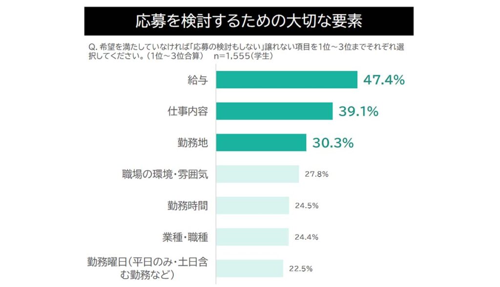 学生がアルバイト探しの際に「希望を満たしていなければ応募も検討しない」条件として、「給与」「仕事内容」「勤務地」が上位に。この3項目を踏まえ、どう職場の魅力を打ち出すかが重要です。