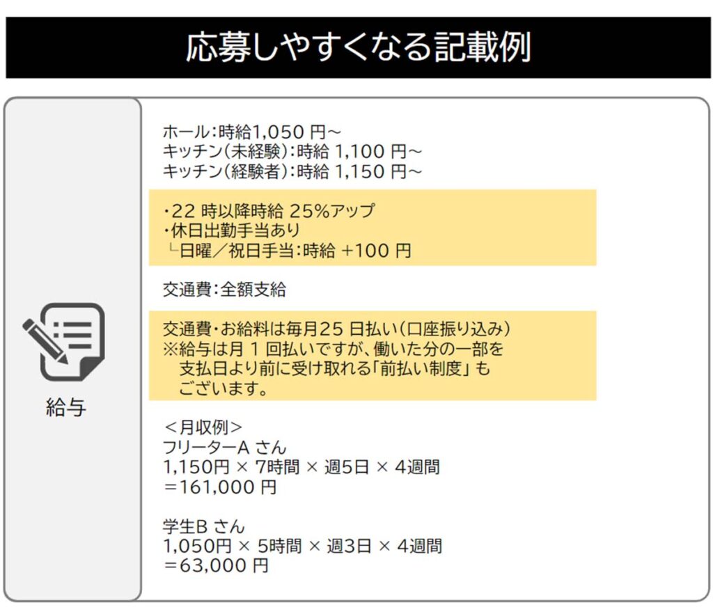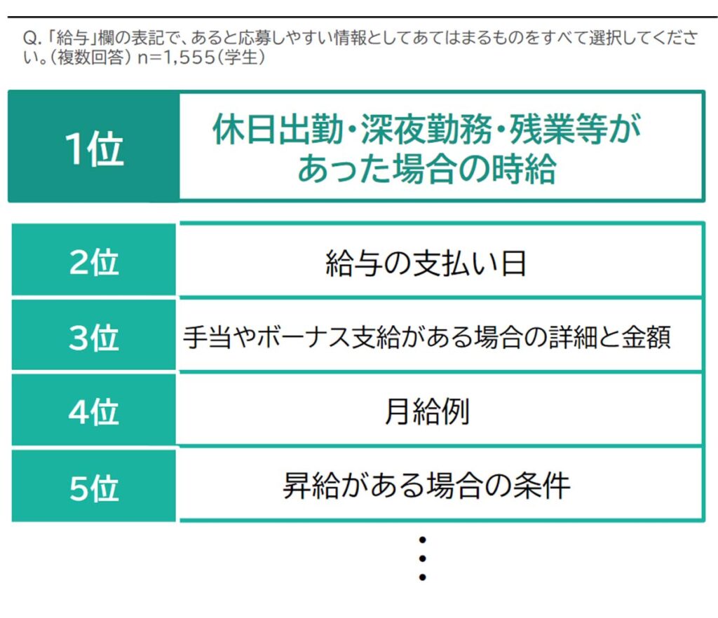 学生の中には、生活費をアルバイトで賄っている層も多く、給与欄に「月収例」があることで応募意欲が高まると回答する割合が多く、支払日や手当の内容に加えて記載することが大切です。
