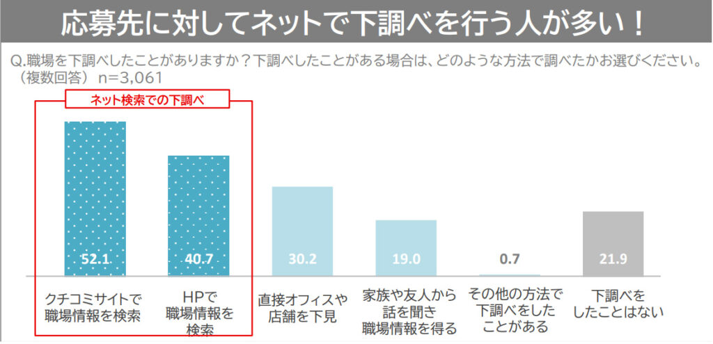 長期連休期間中の求職者は、まず多くの求人情報の中から希望のお仕事をキープし、そこから職場のクチコミサイト情報やHP情報を検索し選別する傾向にあるので、ネット情報に目を通し、HP情報の充実化を図ったり、求人原稿においても求める人材を明確化し、よりアピールしたい内容を前面に出す内容にするなど、他との差別化を図ることで求職者の目に留まる確率が上がると考えられます。