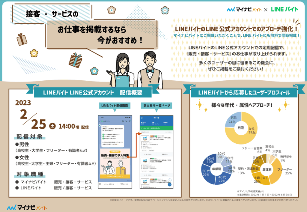 さらに!LINEバイト公式アカウントの定期配信で「接客・サービス」のお仕事が取り上げられます。