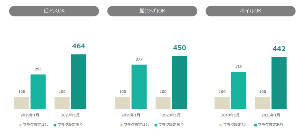 自分のすきな恰好でお仕事をしたいと考える求職者も多く、「ピアス/髭/ネイルOK 」は新型コロナウイルス感染拡大前よりもフラグ設定案件への1件あたりの応募数が増えています。