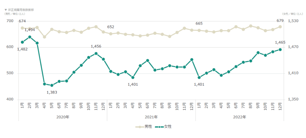 コロナ禍で対人サービスで働く割合の高い非正規雇用で働く女性や子育てをしている世帯の女性への影響は大きく、2020年4月に大幅に減少。その後増減を繰り返していましたが、直近は増加しています。