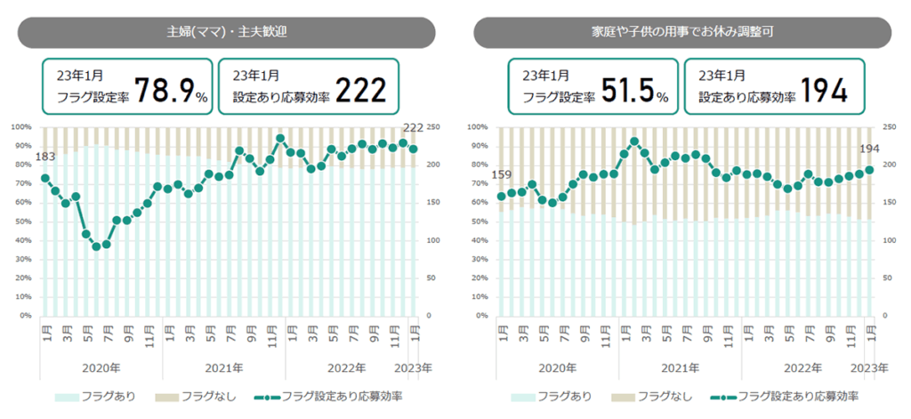 非正規で働く女性が増えていくとともに、「主婦(ママ)・主夫歓迎」や「家庭や子供の用事でお休み調整可」フラグを設定している案件に応募が集まっています。