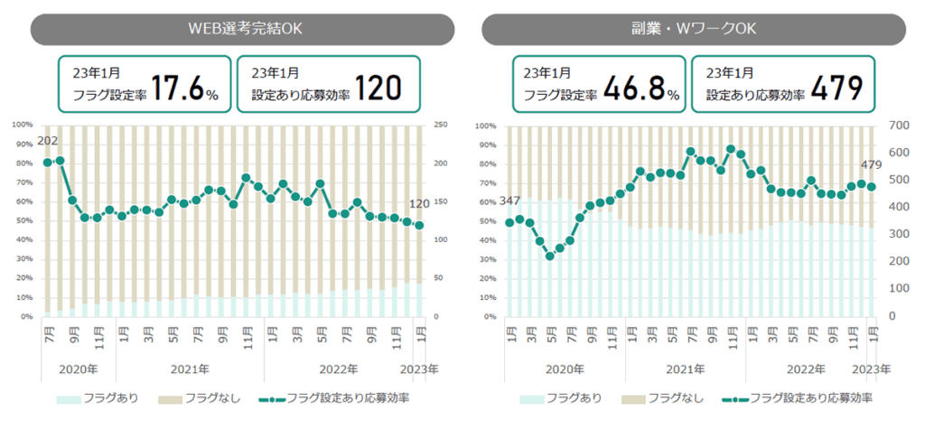 「副業・W ワーク OK 」は、フラグ設定なし案件よりもフラグ設定あり案件の方が応募効果が高い。