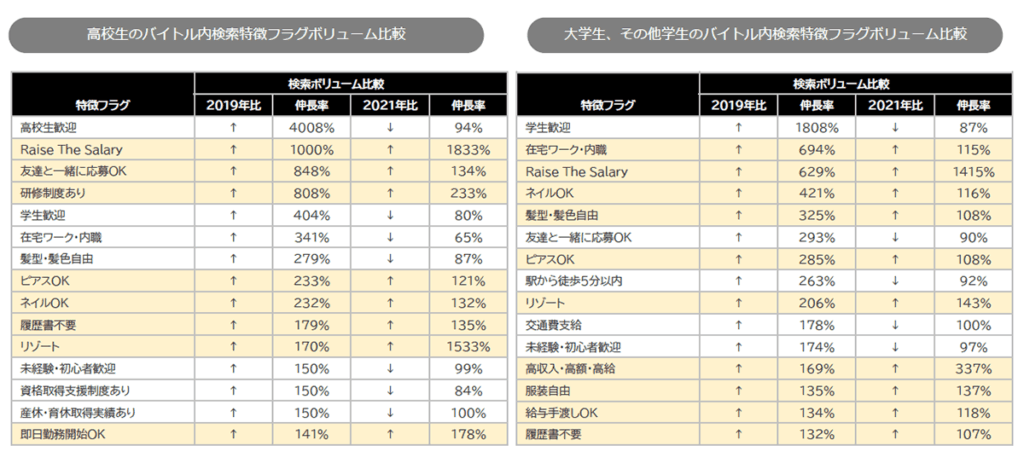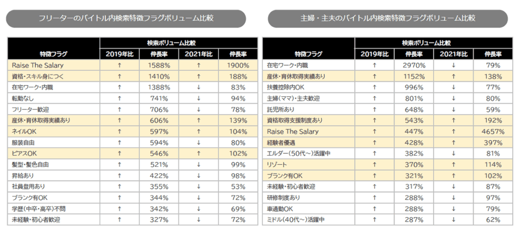 新型コロナウイルスの感染拡大前の2019年と比較し、アルバイトを通してスキルが身につくお仕事やライフイベントの有無に関わらず、お仕事に復帰できる環境が整う職場を探す傾向が強まっています。