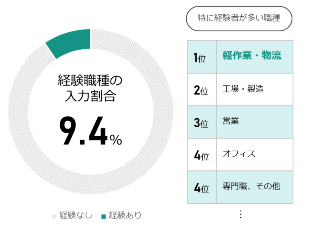 バイトルNEXT 応募者のうち 、 特に 軽作業 ・物流 、 工場 ・製造 の経験者が多い。