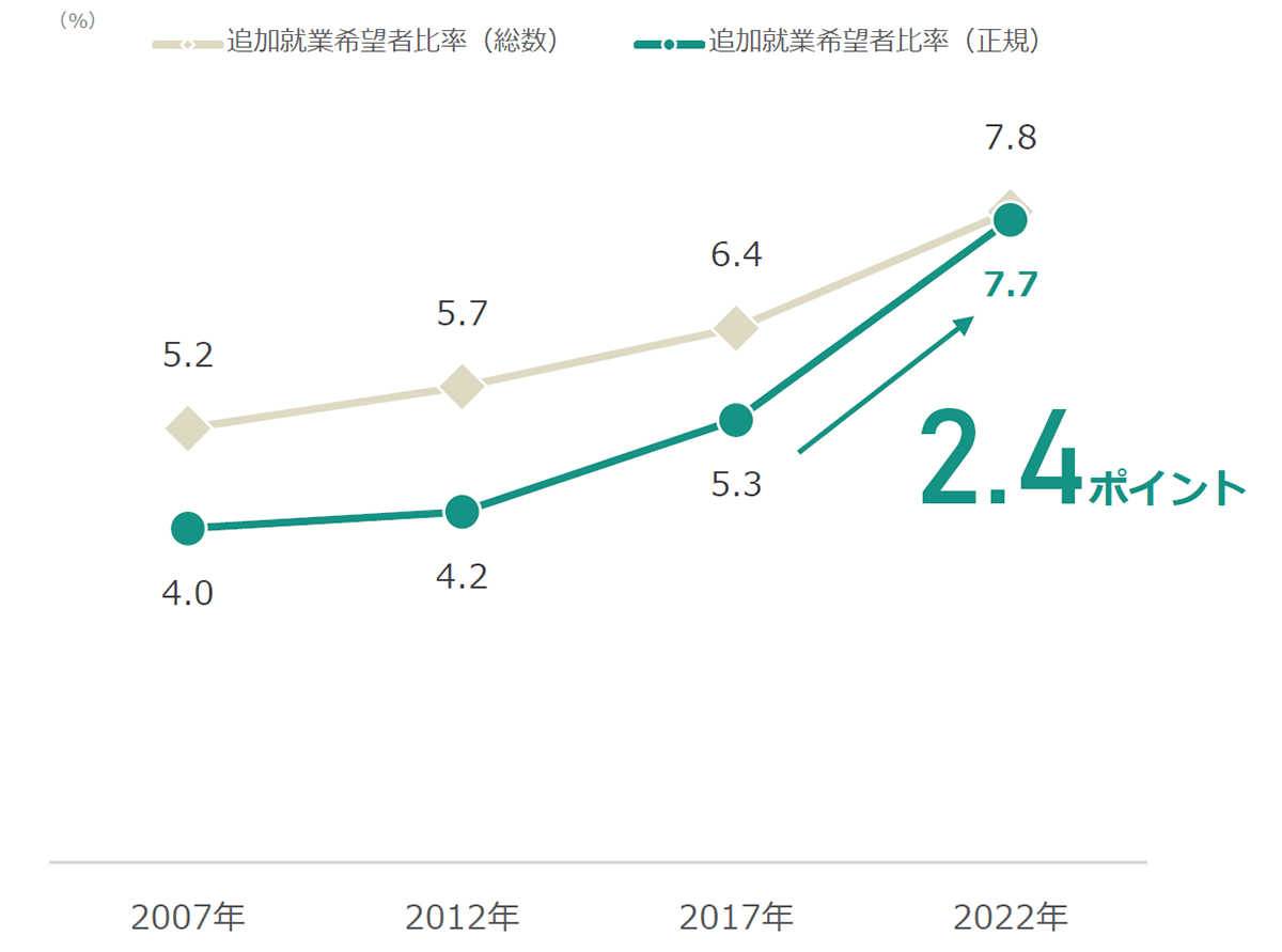 さらに希望者比率を雇用形態別にみると「正規の職員・従業員」は7.7 %と2.4ポイントも上昇。