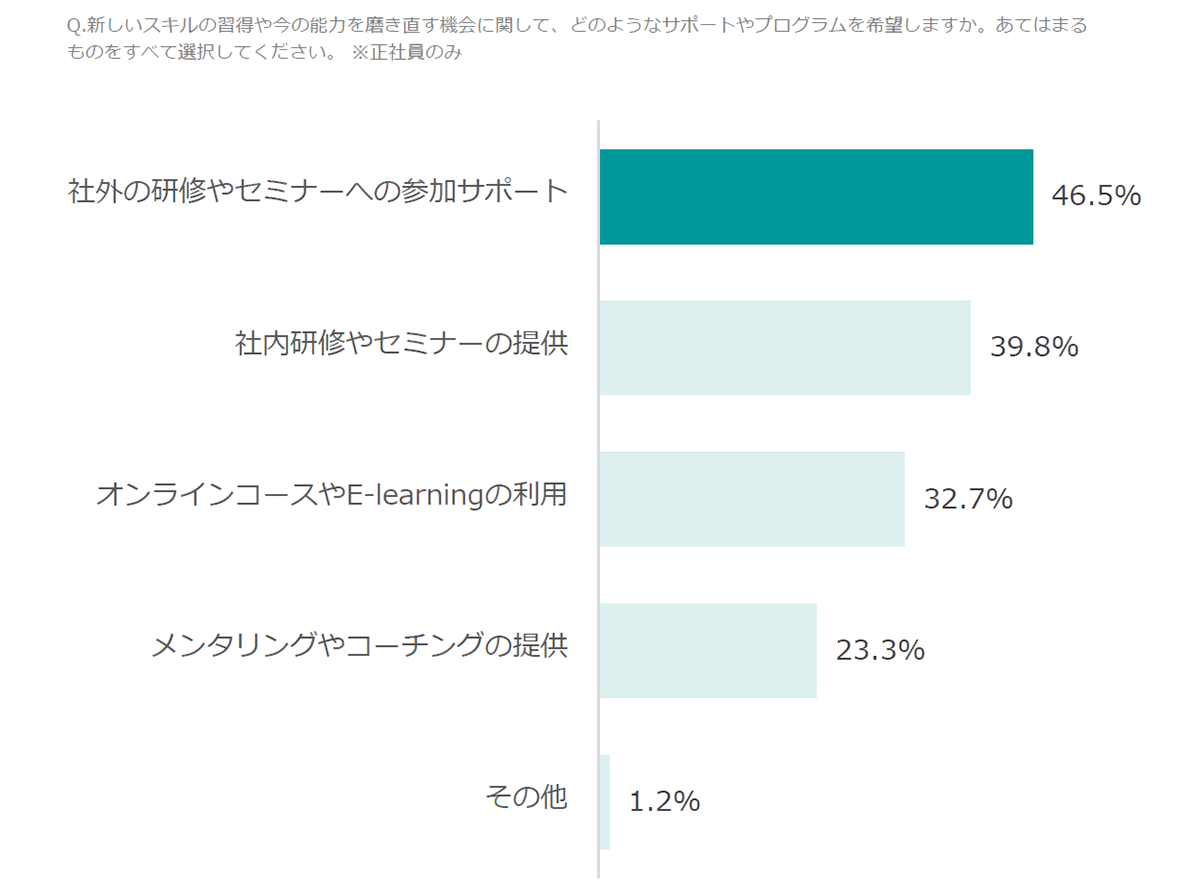 Q.今、働いている職場にて、新しいスキルの習得や今の能力を磨き直す機会があった場合、どのようなスキルを学びたいですか。あてはまるものをすべて選択してください。(希望しない/興味がないを除く) ※正社員のみ
