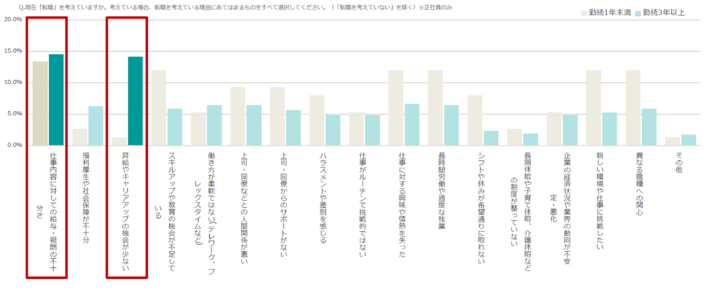 給与や報酬の不十分さが転職を考える1番の理由になる中、特に勤続3年以上は「昇給やキャリアアップの機会の少なさ」が次に多い理由になります。