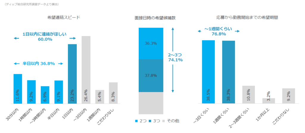 応募から1週間以内に勤務開始したい方が多いため、応募から1日以内に連絡を希望する方が大半。