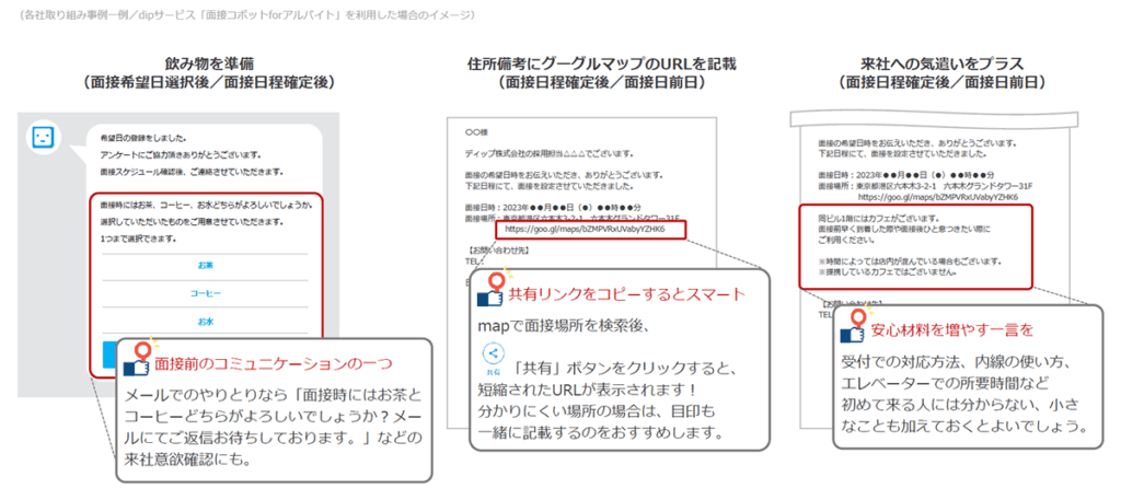 ※dipでは「面接コボット for アルバイト」という応募対応・面接調整ツールを扱っています。
