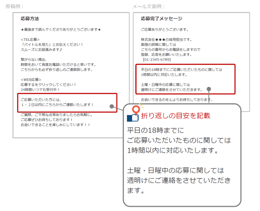早期勤務希望者や他のお仕事と悩んで複数応募している応募者にとって応募対応のスピードが面接に行くかどうかの判断軸。