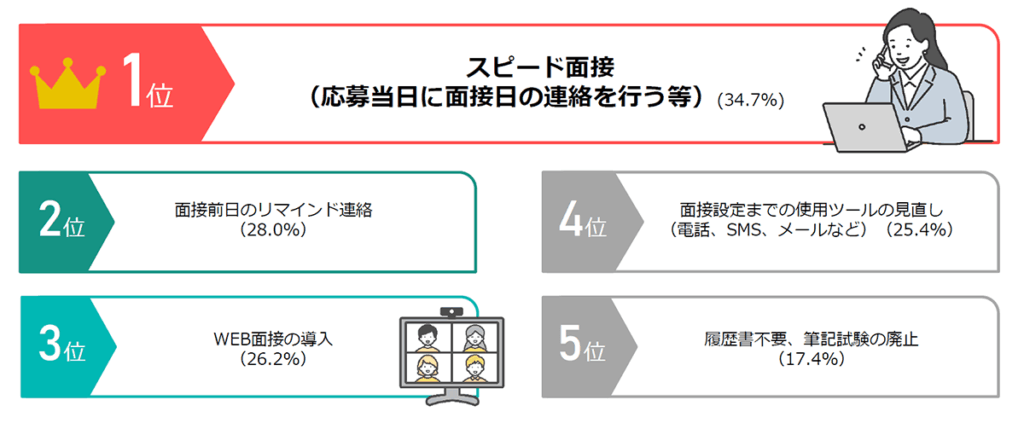 スピード面接以外にも、面接前日のリマインド連絡、WEB面接の導入が上位に。