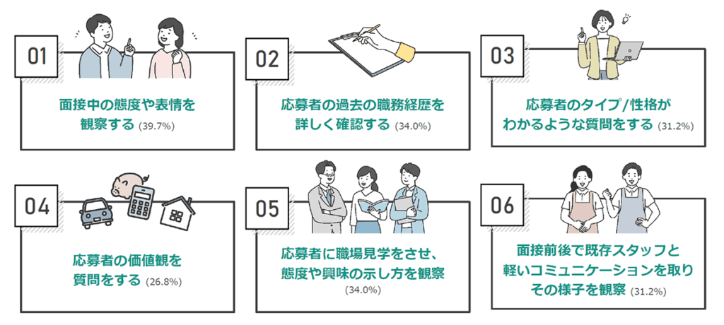 適切な人材を採用するために行っていることとして「面接中の態度や表情を観察する」が上位。