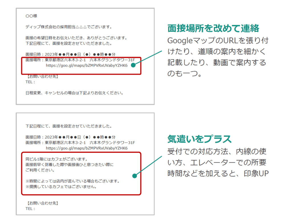 応募者の緊張を和らげるための配慮や、当日の手順について具体的に伝えることで、安心感を与えることができます。