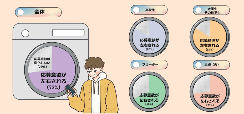 属性に関係なく、7~8割の人が「写真の内容によって応募意欲が左右される」と回答しており、写真の内容が応募意欲に与える影響の大きさが分かります。