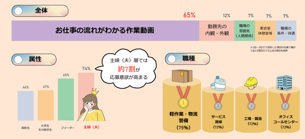職種別にみると、販売・フード・飲食では「制服やネイルなど服装の写真」が、軽作業・物流・警備・サービス・清掃では「外観・内観の写真」が応募意欲を高めました。