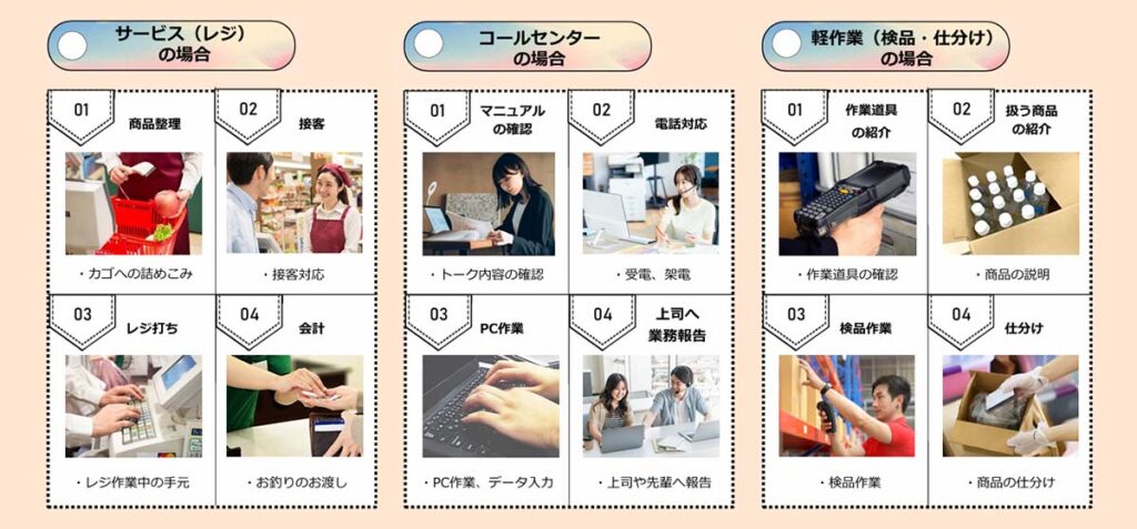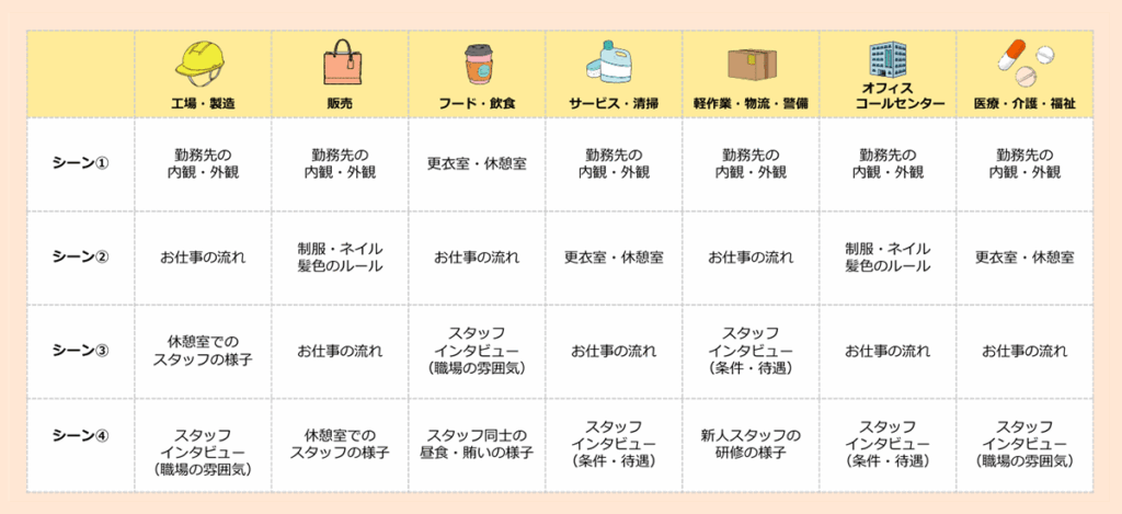 具体的にお仕事の流れを伝えるためには、具体的な作業を5秒~10秒以内で紹介し、文章だけでは伝わらない仕事内容を動画で伝えましょう。