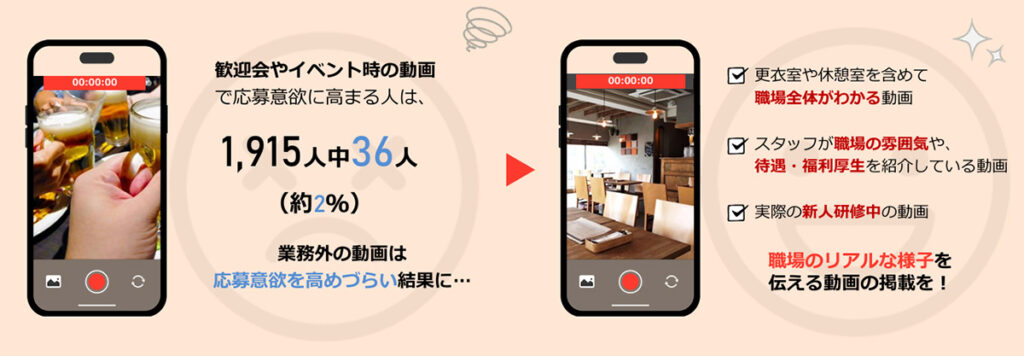 プライベートではなく、職場のリアルな様子を伝えられる動画の掲載がおすすめです。