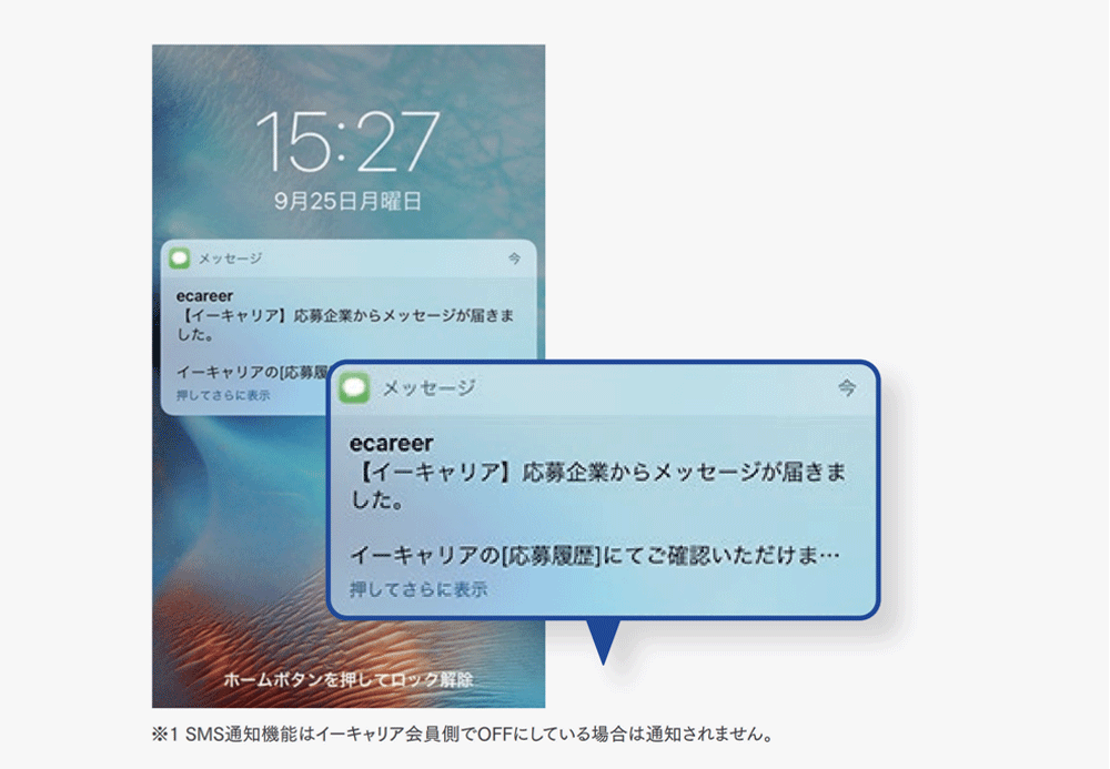 イーキャリアではメッセージを送ると求職者の携帯電話に通知され、重要な連絡の見落としを防ぎます。